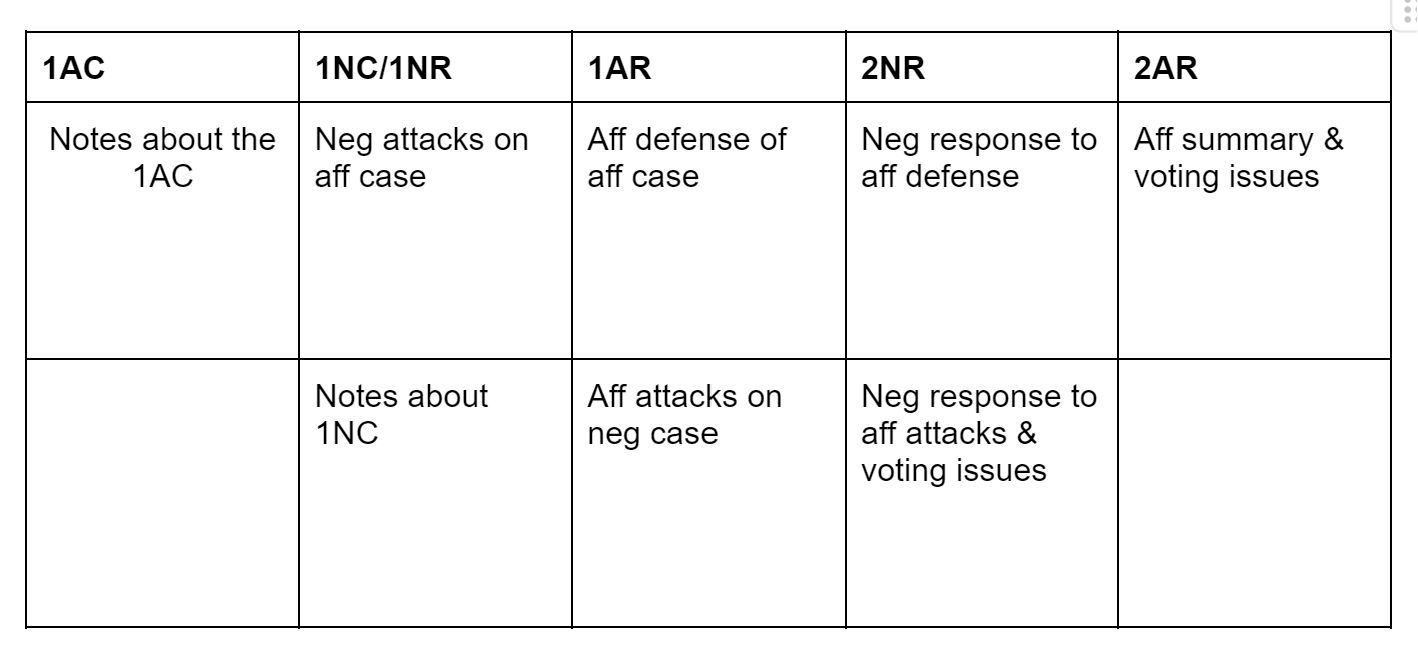 In order to clash in a debate round and generate productive argumentation, debaters write down both their opponents’ attacks and notes for their own speeches and responses to opposing arguments. This practice is known as “flowing.”Below is an outline of what a flowsheet for a single round would look like.
